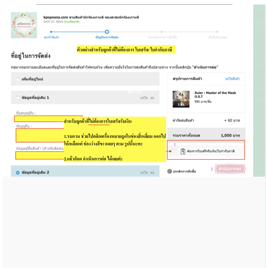- ถ้าลูกค้าต้องการให้ร้านออกใบเสร็จให้ด้วย ตอนสั่งของให้ คลิกที่ช่อง ต้องการใบเสร็จ/ ใบกำกับภาษี